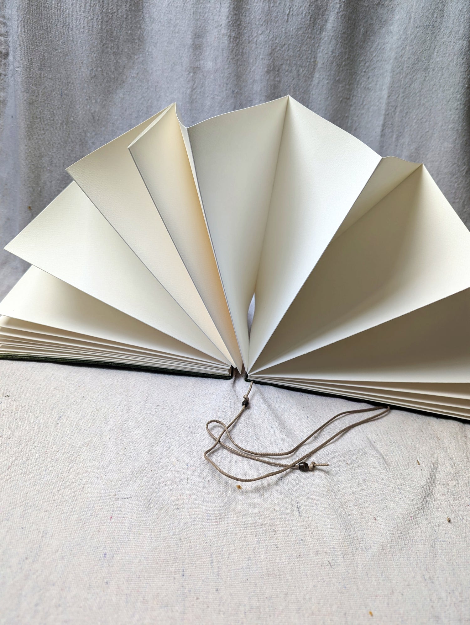 A versatile binding traditionally with a soft cover and a cord, but that can be adapted to a hard- cover, minimalist sewing or adorn with a ribbon rather than a cord. Very adaptable, it is suitable for journals, sketchbooks and photo albums